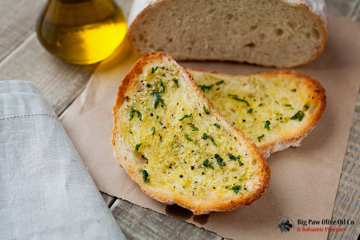 Using olive oil instead of butter on bread is a great way to make a loaf of flavorful garlic bread without the guilt. The peppery notes of olive oil help enhance the uniquely savory flavor of fresh garlic. Combine your favorite olive oil with finely minced garlic and your favorite fresh herbs. Feel free to add cheese for a more decadent treat!