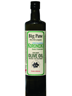 GOLD medal at the New York Olive Oil Competition this Koroneiki olive is grown in Brooks California. It is originated in Greece, where it’s grown to produce oil. These trees have been around for over 300 years. It’s a big olive oil producer, but the Koroneiki olive itself is very small, but delivers a big flavor kick that fans of Big Paw have learned to love. The Koroneiki olive is high in polyphenols, the chemical substances found in plants that may reduce the risk of heart disease and cancer. Koroneiki olives represent about 10 percent of the olives grown in Brooks California. Greek Koroneiki EVOO has a robust fruity nose with a strong, peppery finish. It’s characterized by aromas of fresh grass and artichokes.